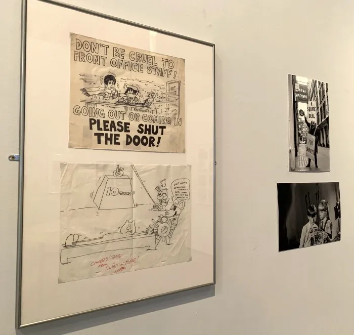 As I wandered around the exhibition, I noticed two very tongue-in-cheek workplace posters. Yup, even staff notices were an outlet for his talents.