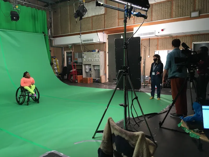 The massive green screen studio created by UCA students for the dance videos, which are aimed at children of all abilities.