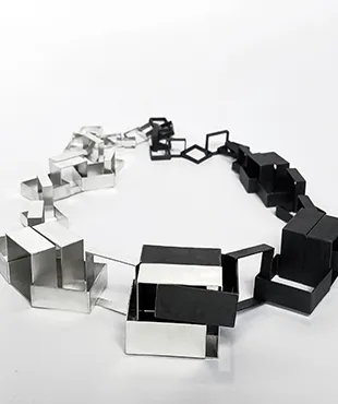 Cube Box Chain is a work created by Seongeun Kim, which was selected for its unique geometric form. Seongeun, who is currently studying towards an MA in Jewellery, constructed a chain of cubes made from oxidised and sterling silver. Each cube represents a place, time, or experience in Seongeun’s life.